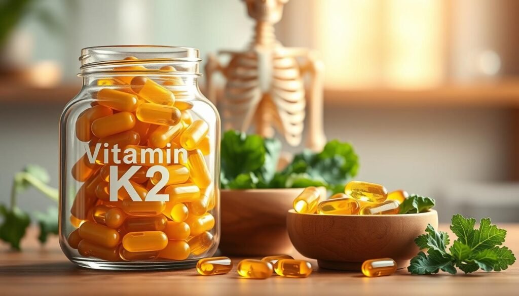 Para os ossos, K2 ativa a osteocalcina. Isso ajuda a fixar o cálcio e manter a densidade óssea. Com vitamina D3 e cálcio, ela ajuda a prevenir a osteoporose.