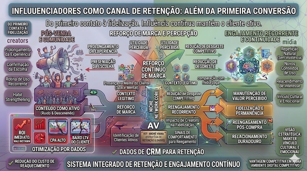 Esse reforço é particularmente importante porque retenção não é apenas questão de funcionalidade. É também questão de percepção. Muitas vezes, o que mantém o cliente ativo não é só o produto ou serviço em si, mas a sensação contínua de estar próximo de uma marca relevante, confiável e presente. Influenciadores ajudam justamente nessa camada simbólica, sustentando familiaridade e afinidade.